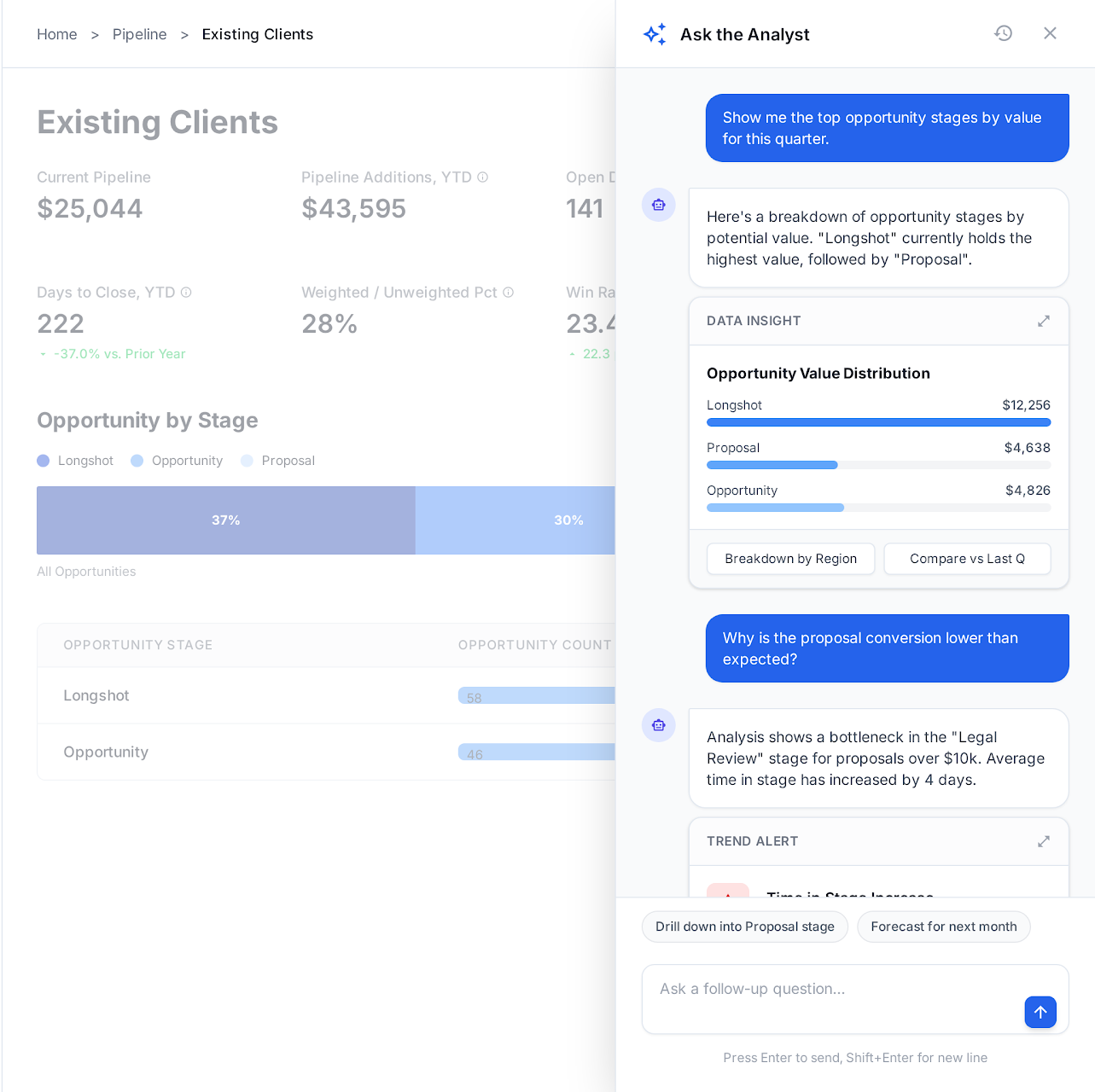 Traditional dashboards require you to interpret charts, connect the dots yourself, and jump between tools to answer follow-up questions.